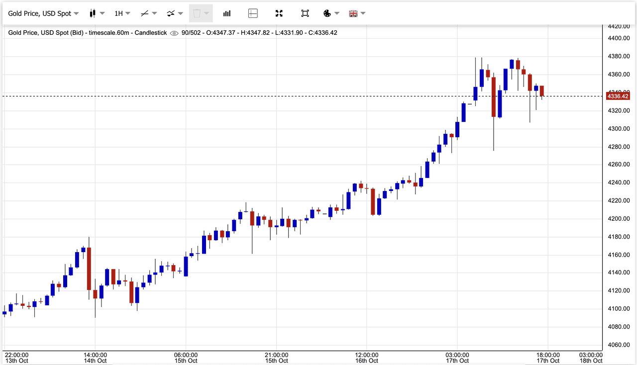 В этом месяце золото вступило в рекордное ралли, поднявшись более чем на 17% за 30 дней и превысив $4325 за унцию по состоянию на 17 октября 2025 года. Рост происходит на фоне сочетания экономических, монетарных и геополитических давлений, которые подпитывают сильный спрос на активы-убежища.