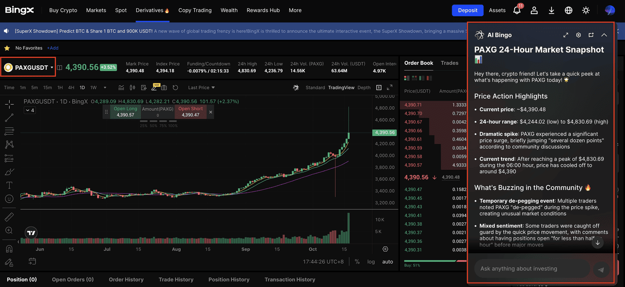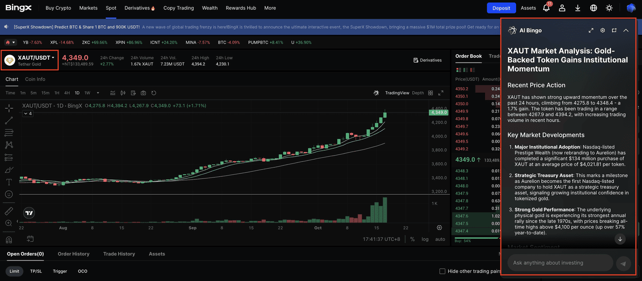 BingX AI, интегрированному непосредственно в торговый интерфейс, вы можете получать аналитические данные в реальном времени, анализ цен и прогнозы рынка золота для принятия более обоснованных торговых решений.