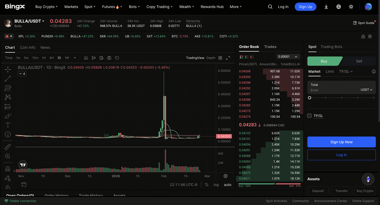 BULLA растет 23 февраля 2026 года из-за мощного технического прорыва с высоким объемом, сопровождаемого резким скачком торговой активности. Этот концентрированный интерес покупателей превысил продавцов, продвигая токен к заметным прибылям и занеся его в число лидеров в категории мем-монет на фоне возобновленного рыночного энтузиазма и потоков капитала, движимых импульсом.