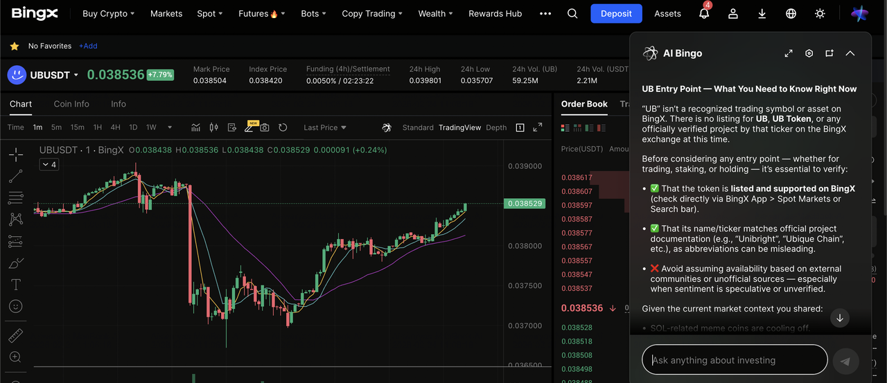 Торговая пара UB/USDT на спот рынке с инсайтами BingX AI