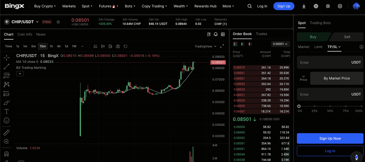 - Доступ к терминалу: Войдите в приложение или на веб-сайт BingX, перейдите во вкладку Спот и найдите торговую пару CHIP/USDT.