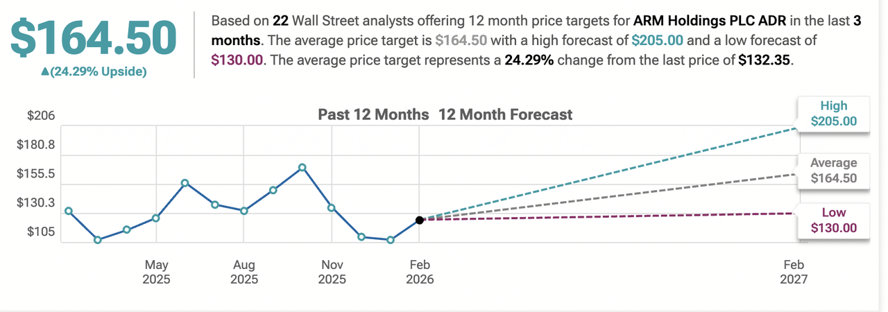 Бики зосереджуються на впровадженні Armv9 та імпульсі IP для ШІ. Якщо Arm Holdings (ARM) підтримує двозначне зростання роялті через мобільні, центри обробки даних, периферійний ШІ та автомобільну галузь, забезпечує додаткові високовартісні ліцензії та скористається розширенням екосистеми, компанія могла б досягти сильного зростання доходу, левереджу маржі та розширення мультиплікаторів. Це позиціонує Arm Holdings (ARM) як фундаментальну архітектуру для інтелектуальних обчислень, підтримуючи цілі $250 або вище до кінця 2026 року.