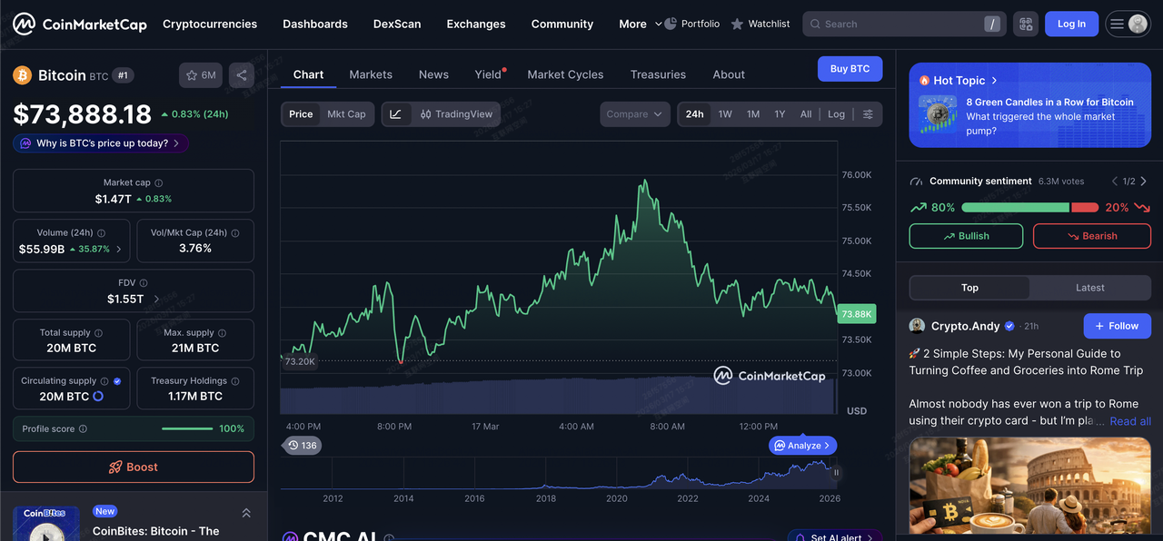 Як найнадійніше джерело для середньозваженої за обсягом ціни (VWAP), CoinMarketCap еволюціонував у всеосяжну карту живого ринку, що забезпечує панорамний вигляд системного впливу Bitcoin на світову економіку. У 2026 році сайт виходить за межі простих тікерів, пропонуючи дані інституційного рівня про домінування Bitcoin на ринку, метрики притоку/відтоку ETF та коефіцієнти кореляції в реальному часі з традиційними активами, такими як S&P 500. Це остаточний ресурс для фундаментальних досліджень, що дозволяє інвесторам візуалізувати історичні цикли та зміни настроїв страху і жадібності через панель керування з великою кількістю даних, що ідентифікує широкі ринкові тренди до того, як вони потраплять до роздрібного мейнстріму.