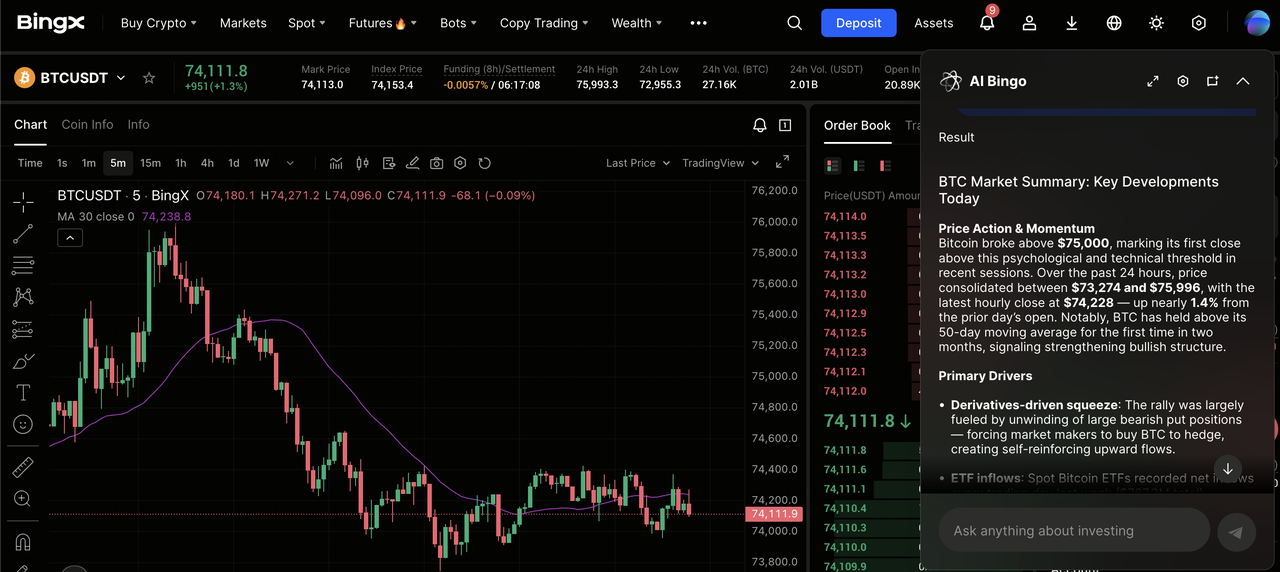 BingX пропонує відстеження ціни Bitcoin в реальному часі на споті та ф'ючерсному ринку разом з дієвими інсайтами від BingX AI