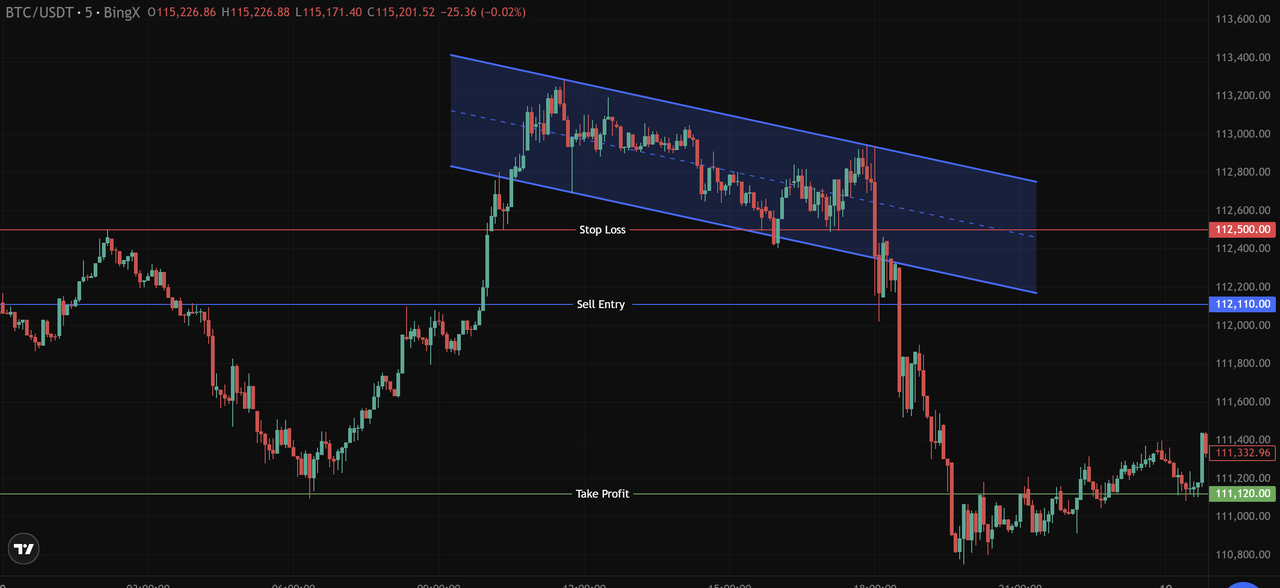 На графіку вище BTC/USDT торгується між $112,160 (підтримка) та $112,440 (опір) на 5-хвилинному таймфреймі. Скальпер може відкрити довгу позицію біля підтримки близько $112,160 зі стоп-лосом на $112,120, ризикуючи $40, і встановити ціль біля опору близько $112,440 для потенційного прибутку в $280.