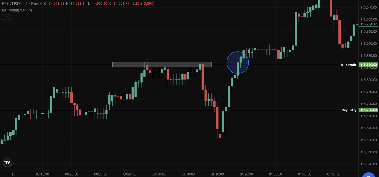 Наприклад, якщо BTC/USDT рухається з $115,700 до $115,850 на одно-хвилинному графіку, скальпер може купити за $115,700 і вийти секундами пізніше за $115,850, щоб захопити коливання в $150. Хоча прибуток з торгівлі невеликий, повторення цього процесу в багатьох торговлях може принести стабільні прибутки.