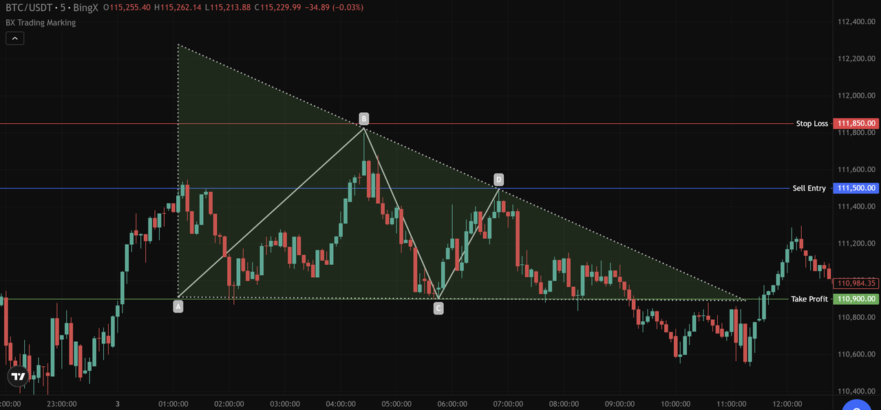 патерн низхідного трикутника. Вхід на продаж за $111,500 зі стоп-лосом вище $111,850 і взяттям прибутку близько $110,900 створив би керованe налаштування. Патерн трикутника дає чіткі рівні для планування торгівлі, допомагаючи скальперам уникнути здогадок.
