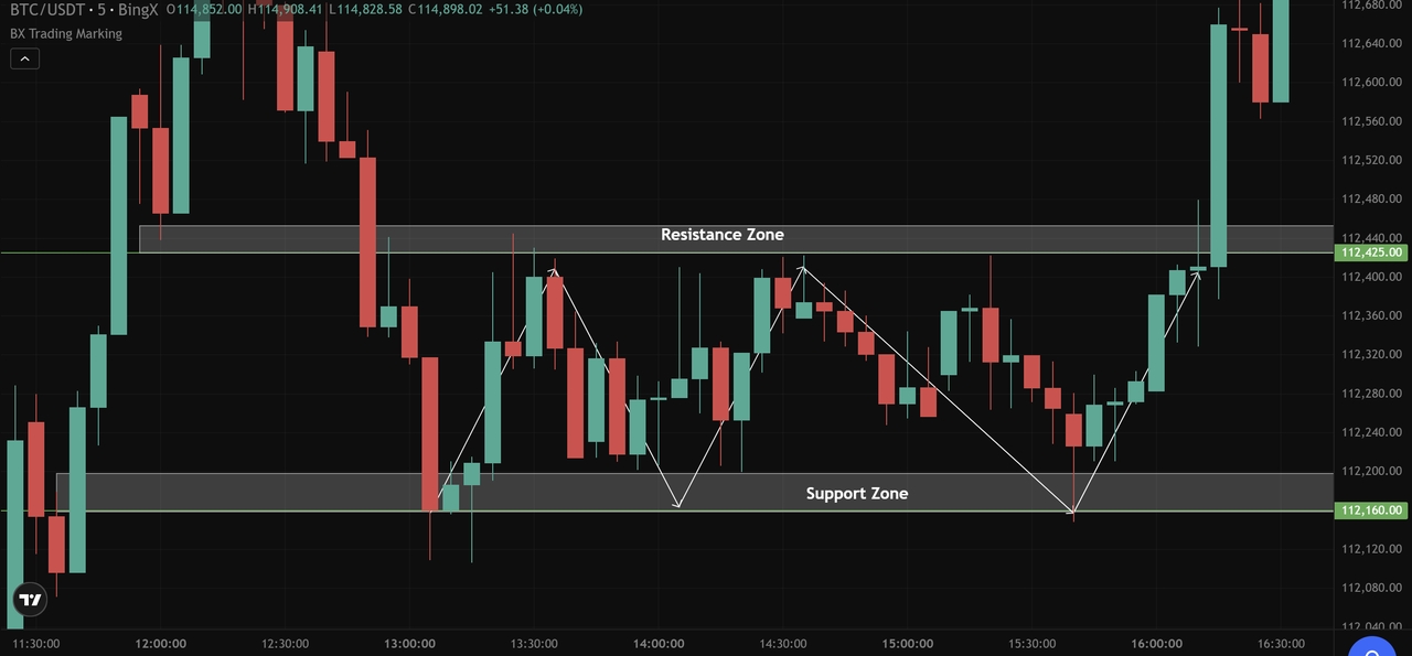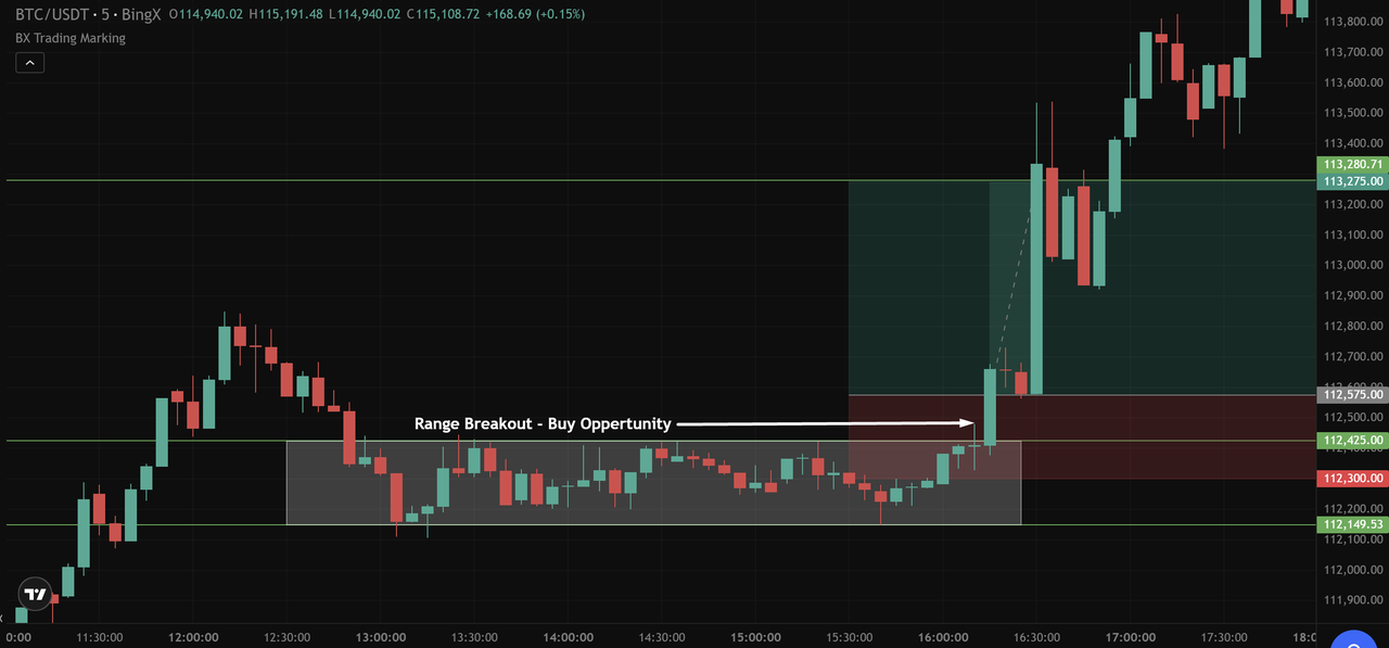 На графіку вище BTC/USDT консолідувався між підтримкою на $112,150 та опором біля $112,425 на 5-хвилинному таймфреймі. Коли ціна пробила вище опору з сильною зеленою свічкою, це сигналізувало про можливість покупки. Скальпери могли увійти в точці прориву близько $112,425 і встановити стоп-лос трохи нижче діапазону на $112,300 для контролю ризику.