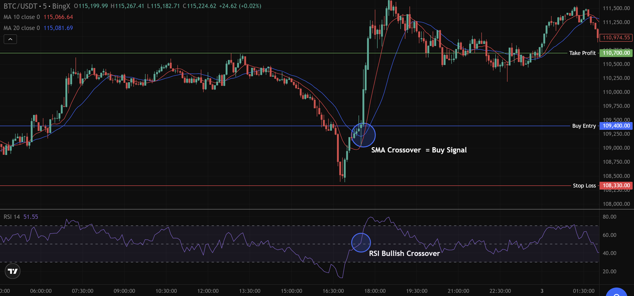 На графіку вище BTC/USDT показав бычаче перехрещення RSI (RSI піднімається вище 30 з перепроданих рівнів) одночасно з перехрещенням короткострокового ковзного середнього вище довгострокового ковзного середнього. Цей подвійний сигнал позначив вхід на покупку за $109,400.