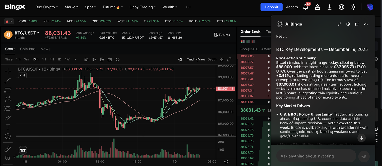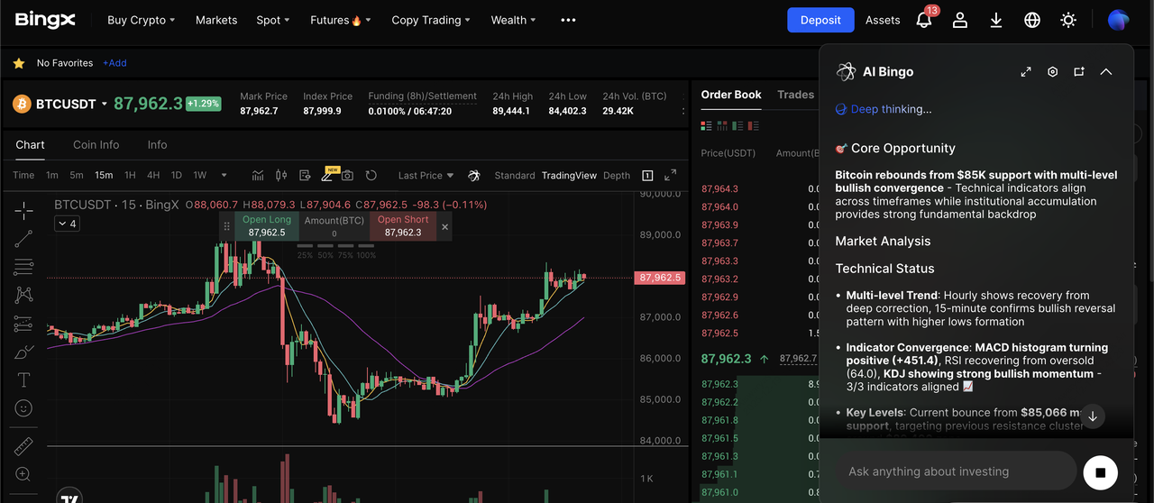BingX допомагає вам аналізувати ринкові тенденції, керувати ризиками та впевненіше торгувати біткоїном, використовуючи дані в реальному часі, розумні інсайти та інструменти професійного рівня, що працюють на базі BingX AI.