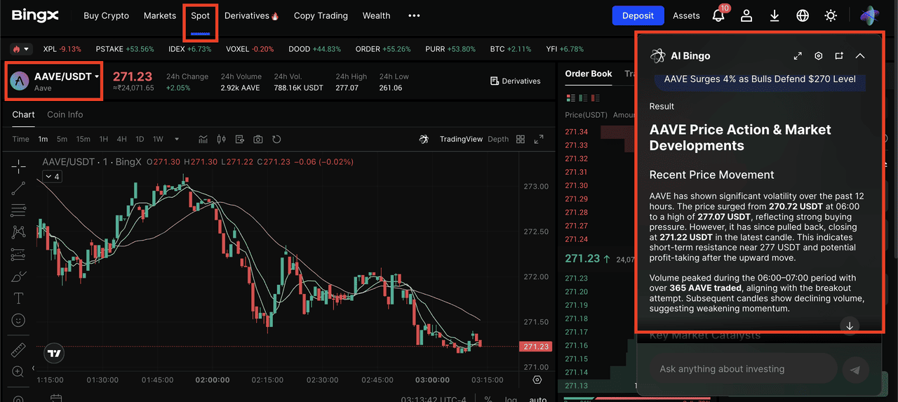 Торгова пара AVE/USDT на спотовому ринку, що підтримується AI Bingo, помічником BingX на базі ШІ