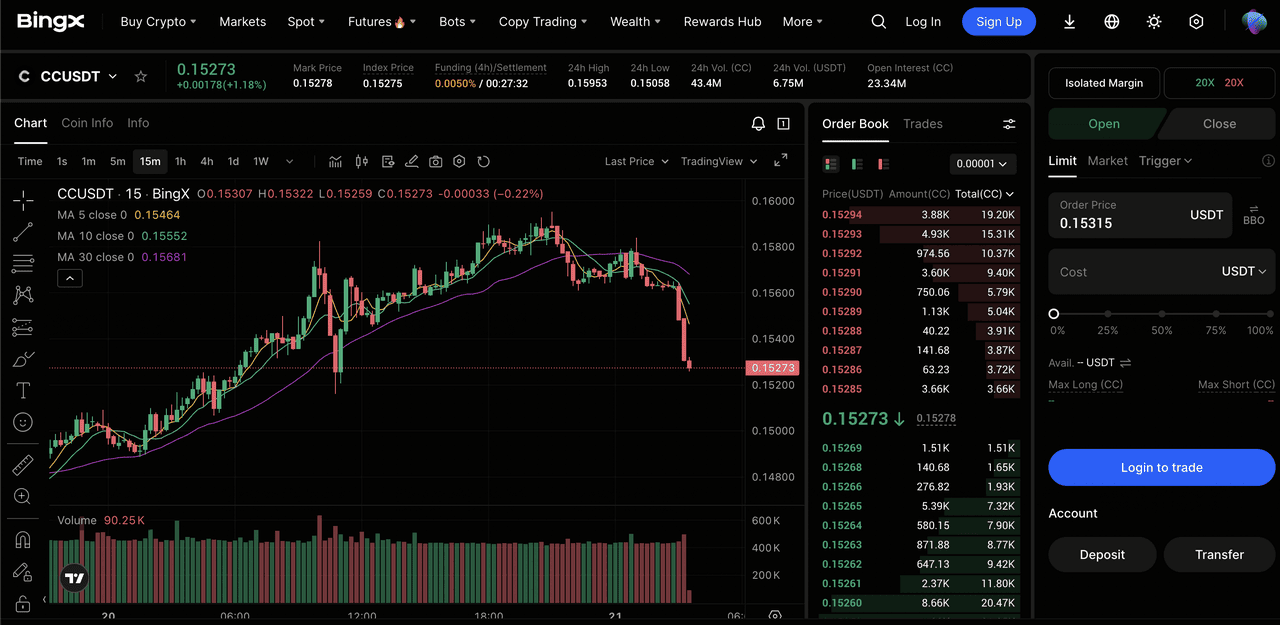 Торгівля $CC на ринку ф'ючерсів BingX дозволяє використовувати кредитне плече та отримувати прибуток від зростаючих і спадаючих цінових тенденцій.