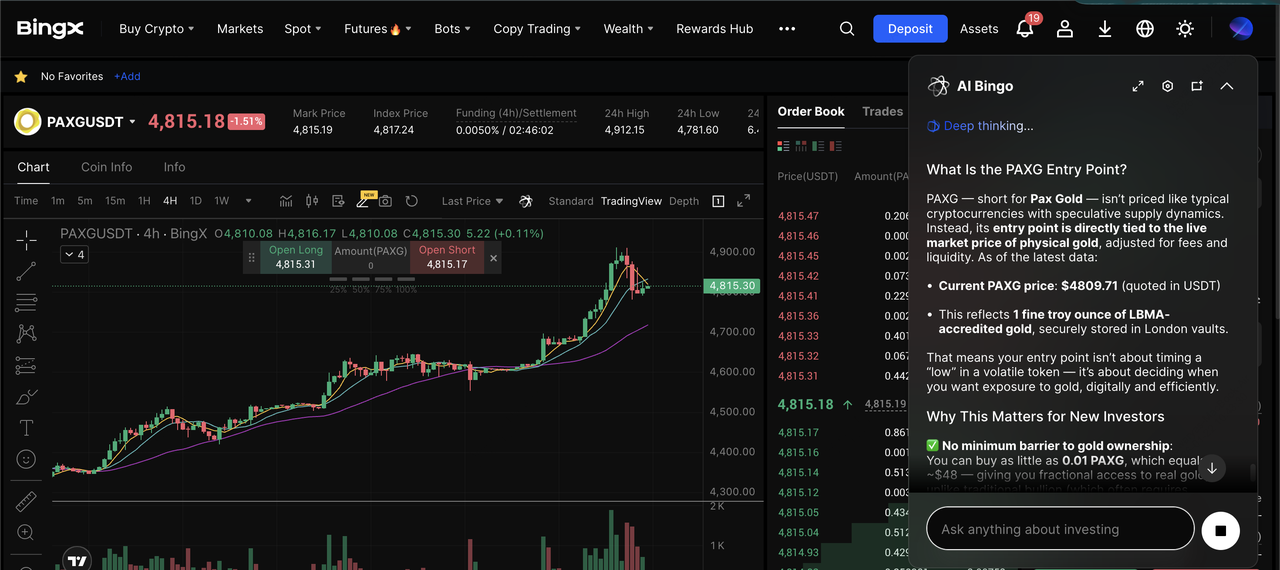 BingX пропонує глибоку ліквідність і тісні спреди для ефективної торгівлі PAXG, підтримувані інструментами на базі штучного інтелекту, які допомагають ідентифікувати тренди та оптимізувати точки входу та виходу. Маючи як спотові, так і ф'ючерсні ринки на одній платформі, трейдери можуть легко переключатися між довгостроковою експозицією та короткостроковими стратегіями, при цьому користуючись глобальним доступом до ринку 24/7 та надійним виконанням.