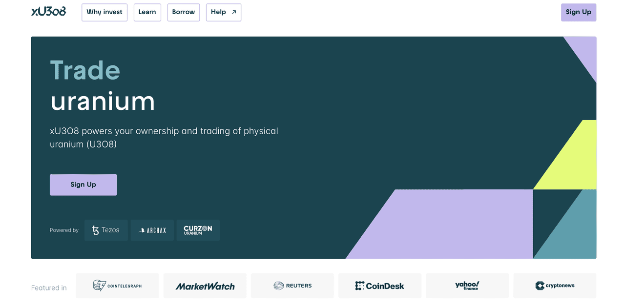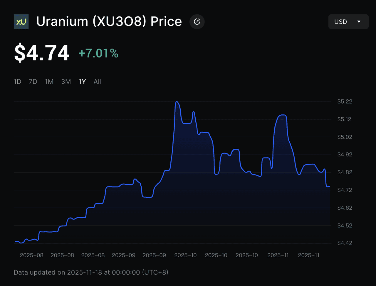 Уран (XU3O8) – це цифровий актив, що представляє часткове володіння фізичним концентратом уранової руди (U₃O₈). Кожен токен відповідає частці реального урану, що зберігається на регульованому об'єкті, що робить його одним з перших способів для звичайних інвесторів отримати прямий доступ до цього сировинного товару без традиційних бар'єрів. Інтерфейс також відображає стрічку спотових цін U₃O₈ у реальному часі, дозволяючи власникам відстежувати рух ринку безпосередньо разом зі своїм токенізованим активом.