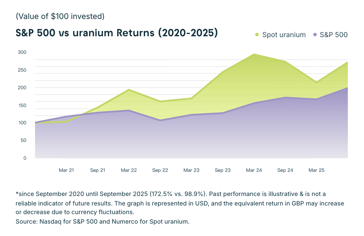 S&P 500 на 98,9% у період з вересня 2020 року по вересень 2025 року. Ця довгострокова міцність, разом зі зростанням інвестицій у ядерну енергетику, прискоренням попиту на електроенергію з боку центрів обробки даних та поновленою увагою до енергетичної безпеки, знову вивела уран у центр уваги інвесторів.