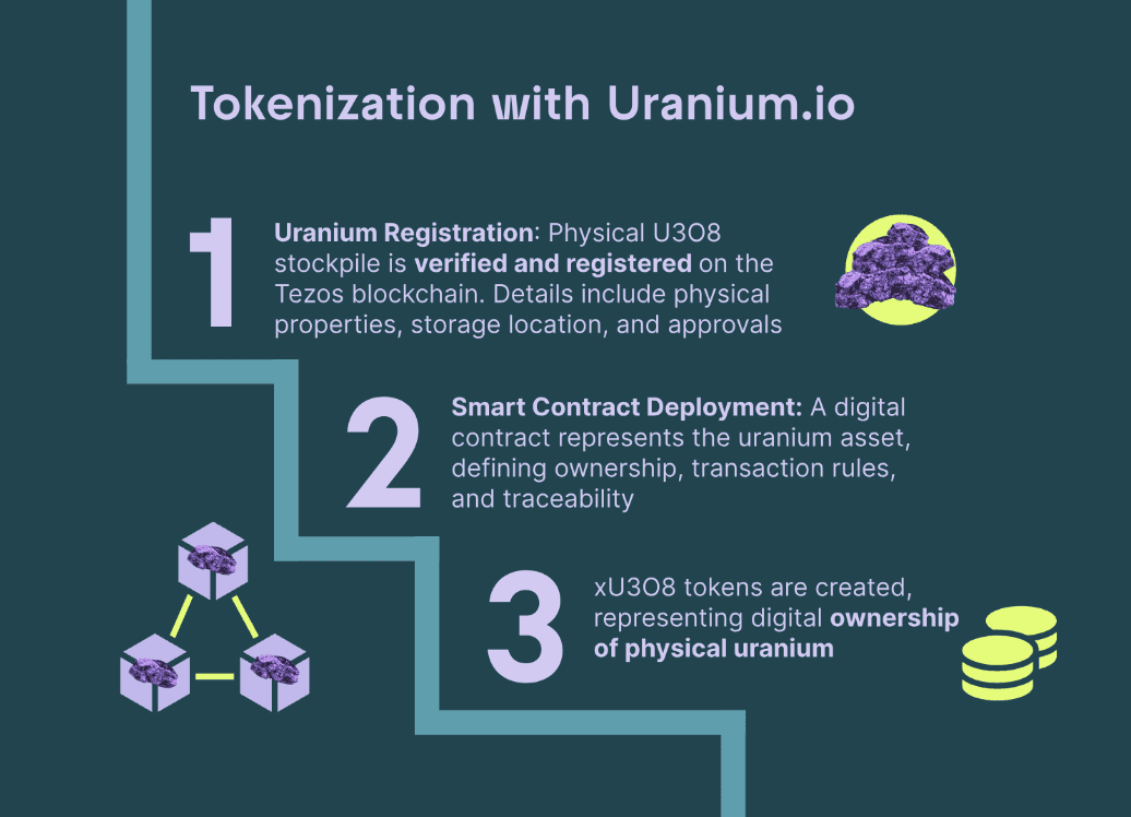 xU3O8 поєднує традиційний ланцюжок постачання урану з технологією блокчейну, дозволяючи володіти та торгувати реальним U₃O₈ у цифровому форматі.