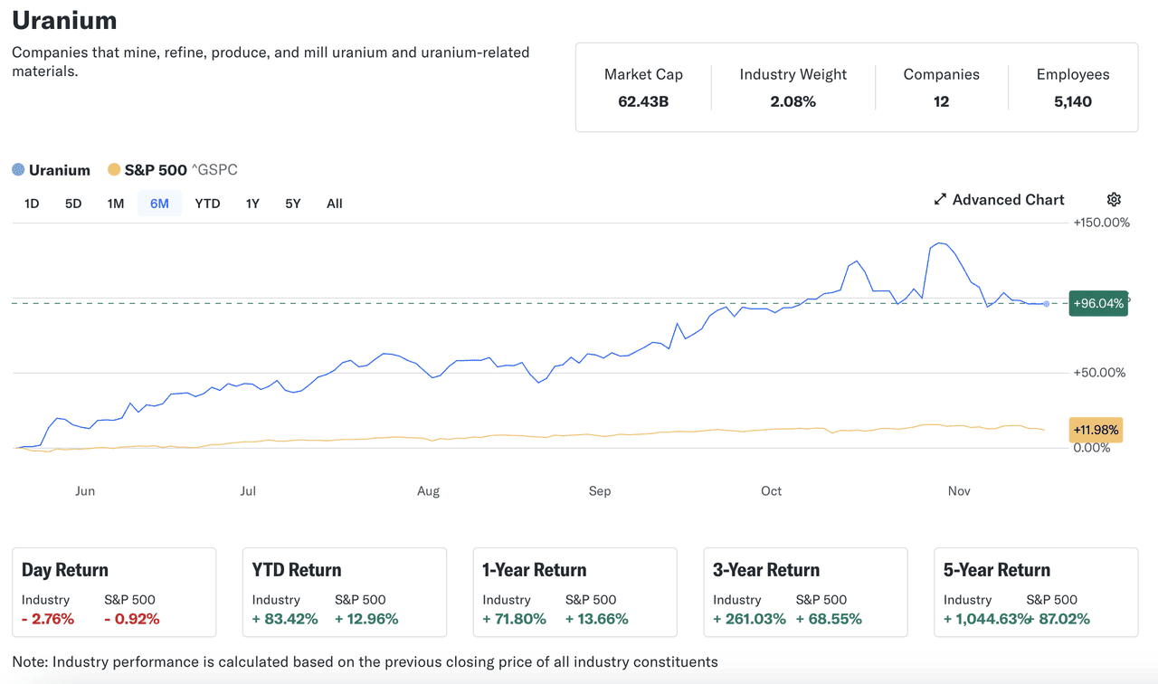 Ринок урану переживає один із найсильніших періодів зростання за останні роки. За останні п'ять років спотовий U₃O₈ приніс 172,5% прибутку, значно випередивши зростання