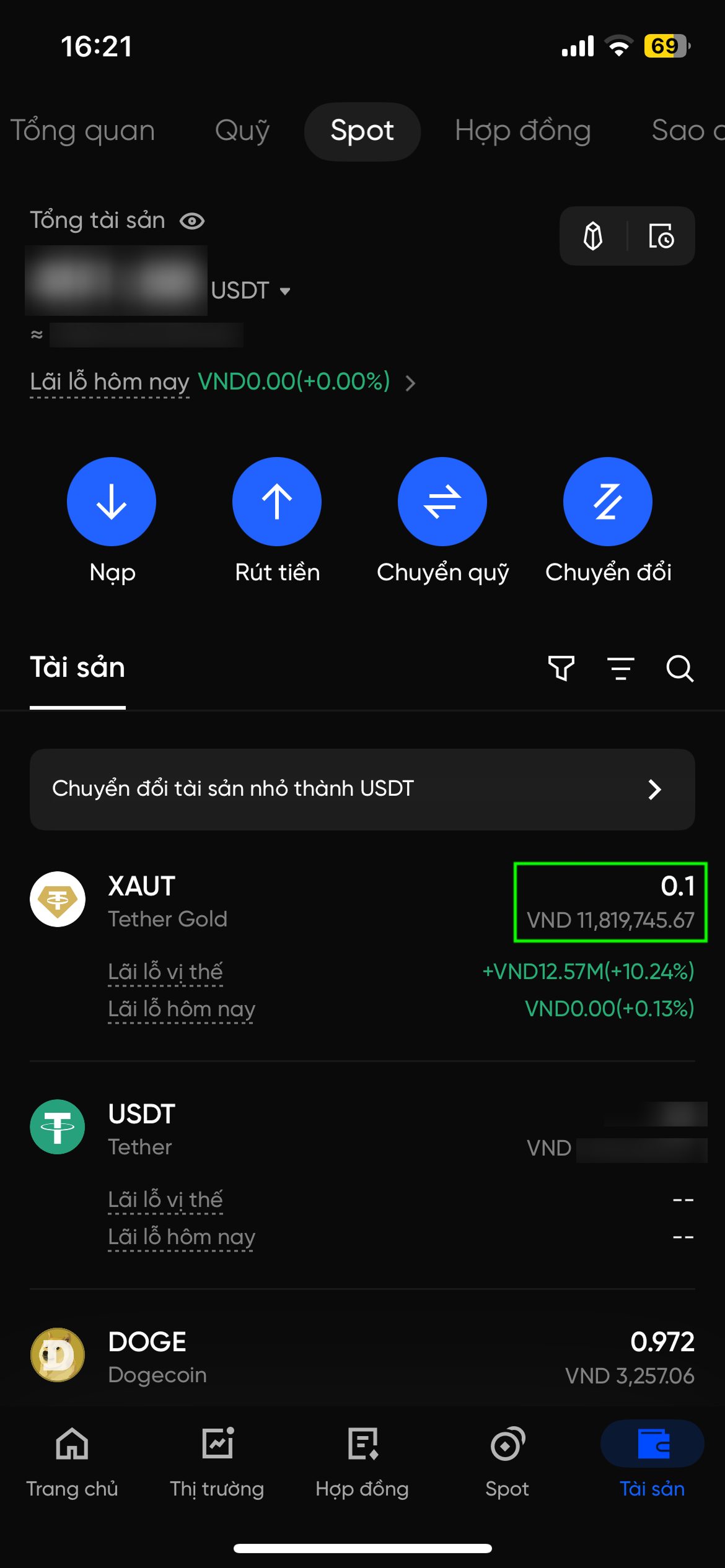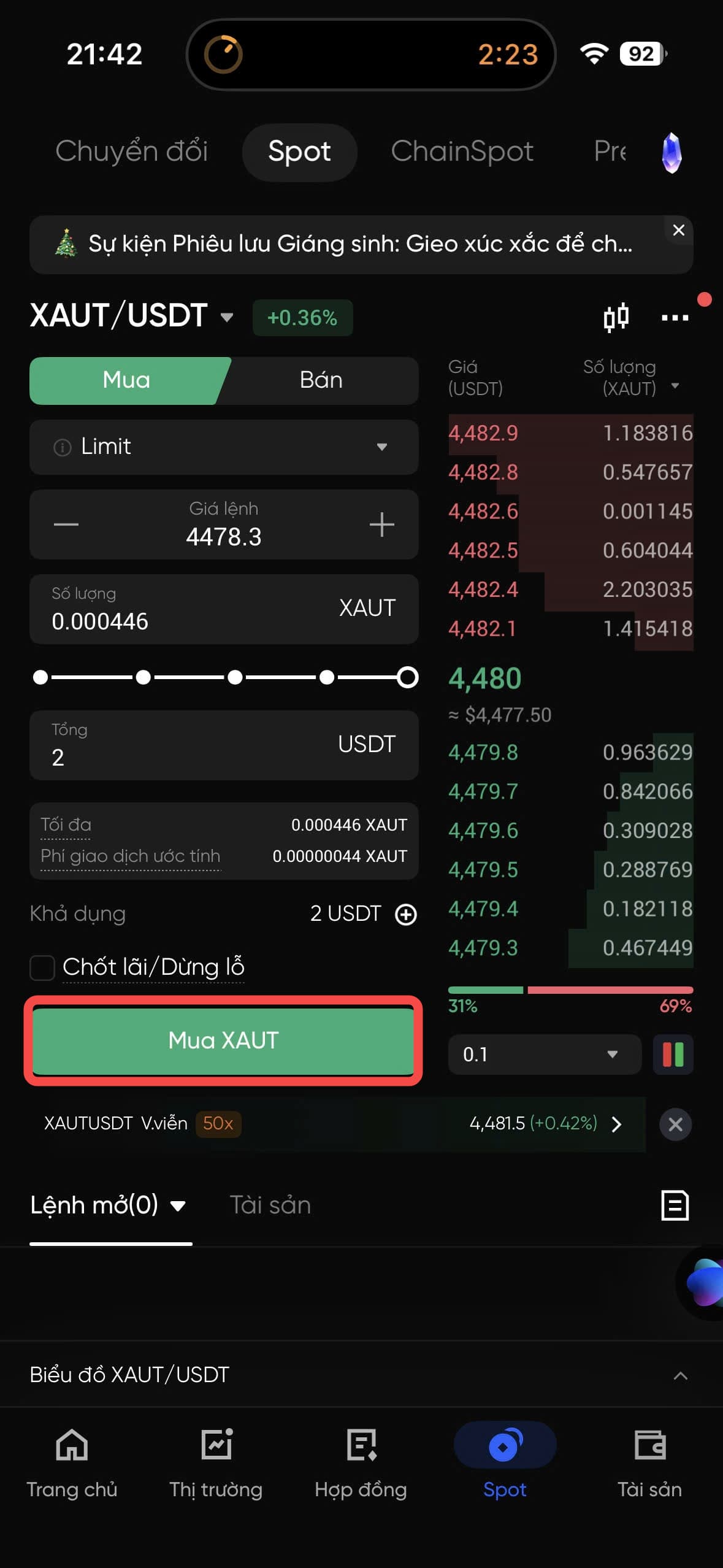 Bước 2: Truy cập thị trường Spot, tìm kiếm cặp giao dịch XAUT/USDT.