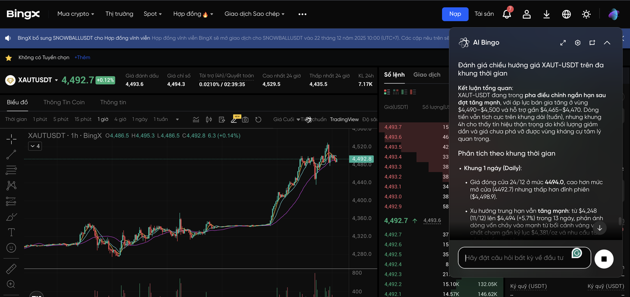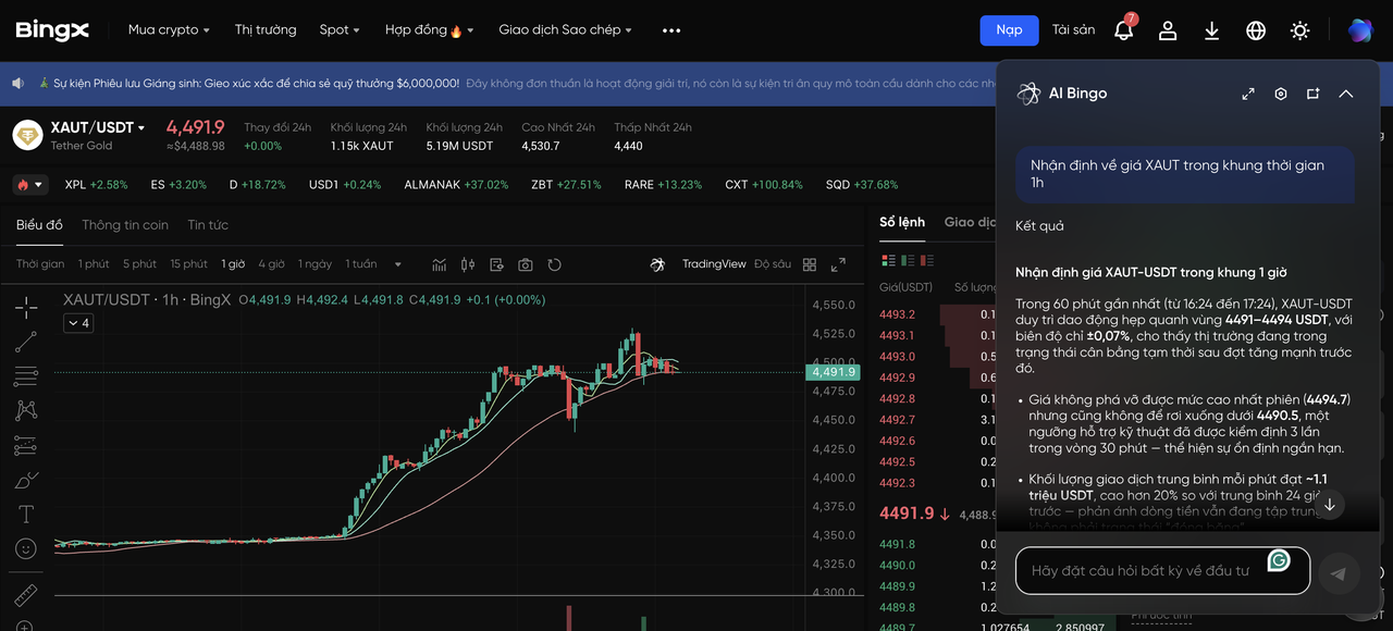 Bạn có thể dùng AI Bingo để tham khảo về phân tích kỹ thuật theo thời gian thực và vị thế tối ưu dựa trên biến động giá vàng thế giới.