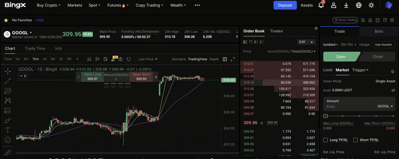 Ngoài các cổ phiếu token hóa của Google, BingX cũng cung cấp GOOGL perpetual futures, cho phép các nhà giao dịch đi long hoặc short các chuyển động giá của Alphabet bằng đòn bẩy.
