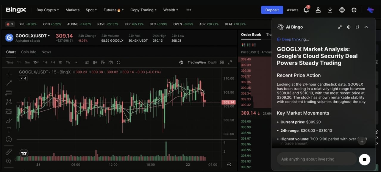 Cặp giao dịch GOOGLX/USDT trên thị trường spot được hỗ trợ bởi quan điểm BingX AI