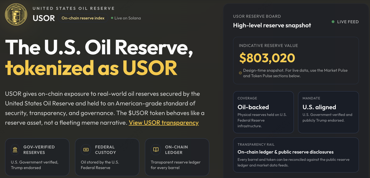 • On-Chain Index: The project markets $USOR as a "reserve asset" rather than a memecoin, claiming every barrel is reconciled against an on-chain ledger.