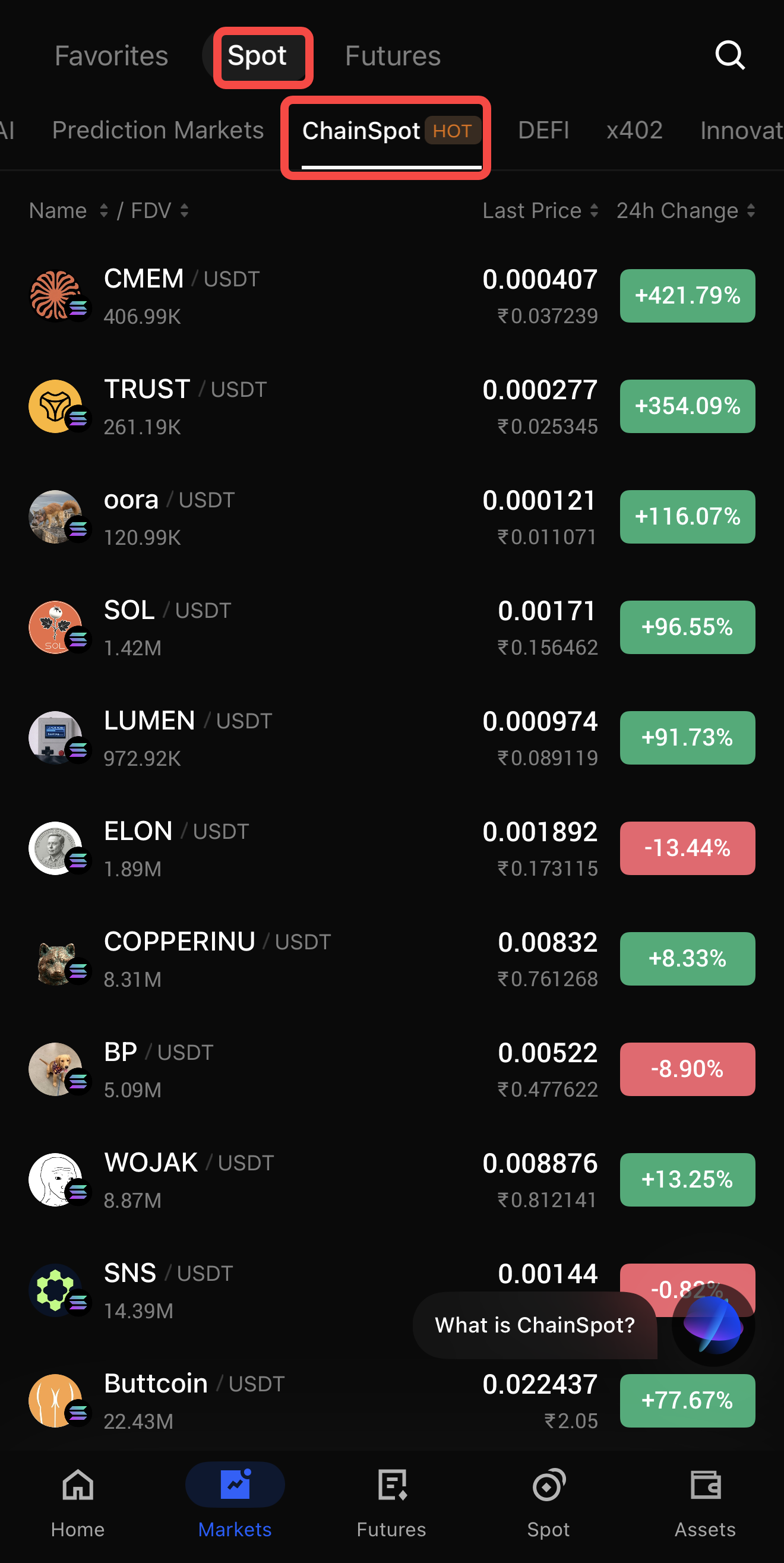 2. Navigate to ChainSpot: Hover over the Spot tab in the top navigation bar and select ChainSpot. If prompted, complete the one-time risk questionnaire to activate on-chain trading.