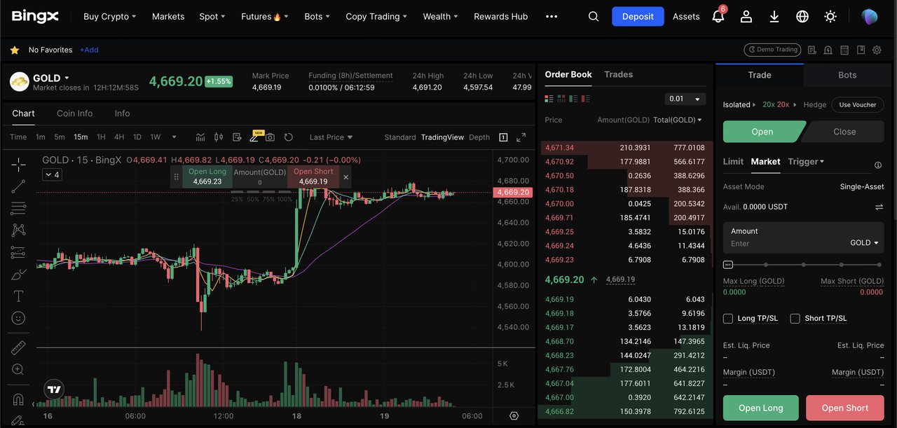 Trong năm 2026, các nền tảng crypto-native làm cho điều này dễ tiếp cận hơn nữa. Ví dụ, perpetual futures có ký quỹ USDT trên BingX TradFi cho phép trader có được price exposure trên chuỗi đối với cổ phiếu, chỉ số, hàng hóa và FX sử dụng cùng cơ chế như perpetual crypto, mà không cần nhà môi giới, thanh toán vật lý, hoặc hệ thống fiat. Perpetual TradFi BingX là các hợp đồng derivative có ký quỹ USDT theo dõi thị trường truyền thống như FX, hàng hóa, cổ phiếu và chỉ số mà không sở hữu tài sản cơ sở. Chúng không có ngày hết hạn, và bạn có thể đi long hoặc short với đòn bẩy có thể điều chỉnh. Chúng cũng tuân theo giờ thị trường khác với crypto 24/7, và có thể liên quan đến phí tài trợ, giống như perpetual crypto.