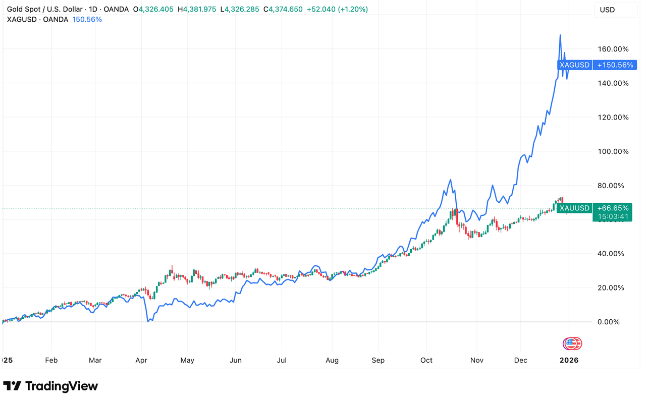 2025 年黃金和白銀漲幅 | 來源:TradingView