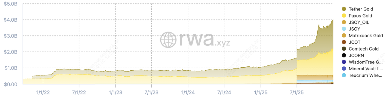 2025 年,代幣化黃金仍是市值主導資產,該領域超過 44 億美元,這得益於 Tether Gold (XAUT) 和 Pax Gold (PAXG) 等產品的持續資金流入。黃金的強勢反映了其在貨幣政策寬鬆、地緣政治不確定性和央行持續累積下的宏觀對沖作用。2025 年 12 月,現貨黃金價格飆升至每盎司 4,500 美元以上,鞏固了黃金在代幣化商品市場中作為主要價值儲存的地位。