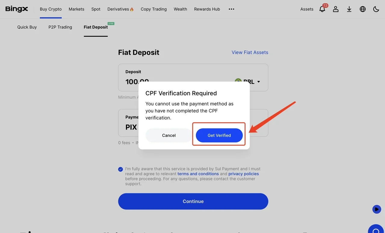 確保您的BingX個人資料已通過最新的CNH或RG驗證。這為您所有的BRL入金活動提供了法律基礎。