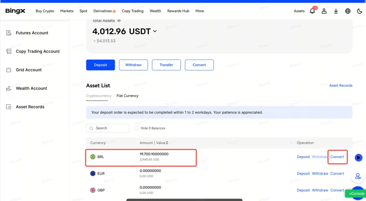5. 將BRL轉換為加密貨幣一旦入賬(通常少於10秒),前往資產和資金賬戶,使用BingX兌換功能將BRL換成USDT、BTC或ETH。