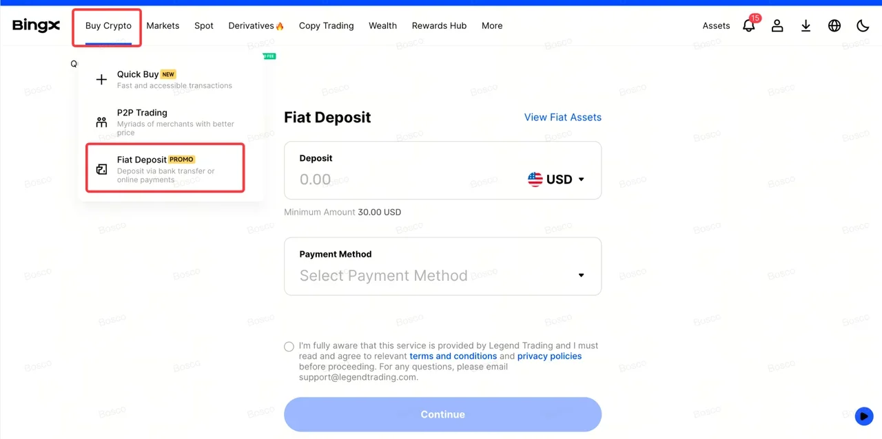 2. 訪問法幣存款門戶:在BingX應用程序或網站上導航至購買加密貨幣和法幣存款。將您的貨幣設置為BRL以激活本地支付軌道。