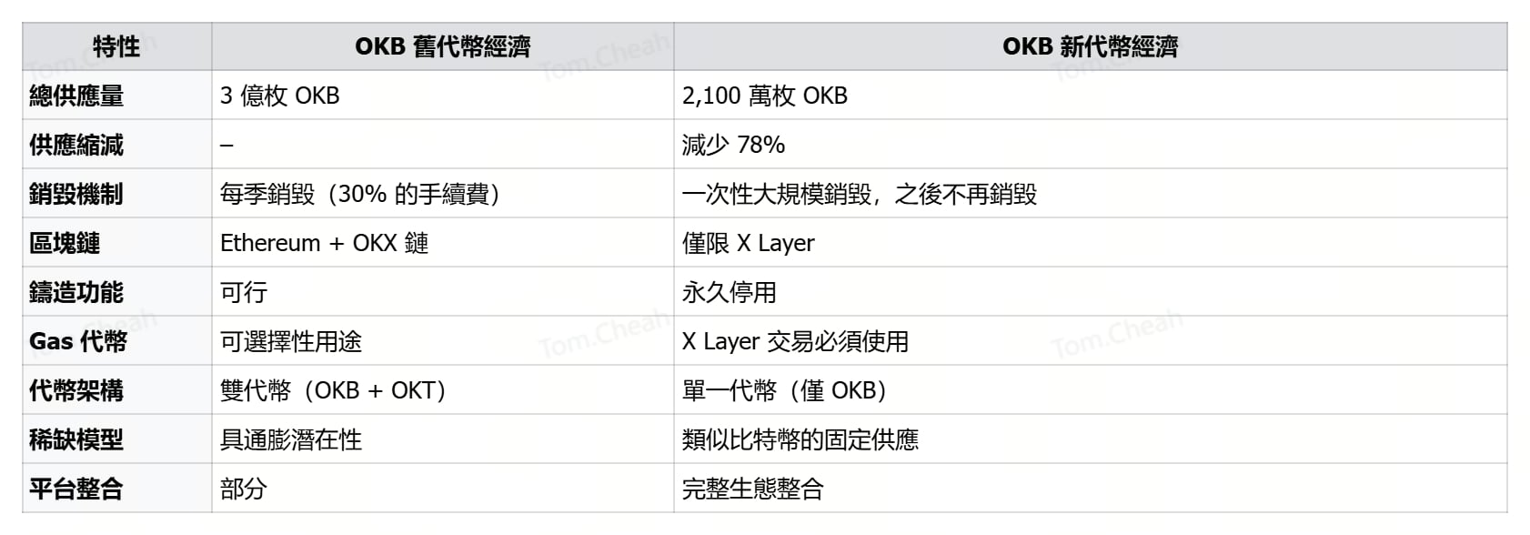 2025 年 8 月的更新為 OKB 的經濟模型帶來自推出以來最重大變化。以下為新舊代幣經濟學對比,突顯一次性銷毀 76 億美元及生態系統向 X Layer 遷移如何重塑 OKB 的供應、效用與整合性。