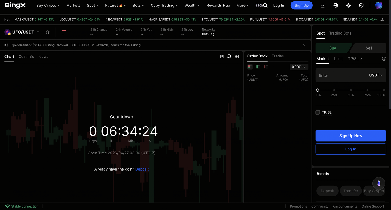 - BingX 提供便利的現貨市場,以具競爭力的條件交易 UFO。
