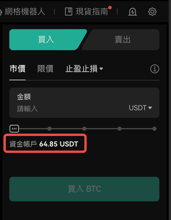- 買單:選擇「買入」,選擇「市價」,輸入金額後點擊「買入BTC」,檢查下單信息後點擊「確定」,您的賬戶就會收到對應的 BTC