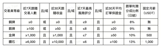 用戶通過交易員申請後,所有合約帶單帳戶等級均為銅牌。帳戶升級條件及對應權益詳見下表說明。